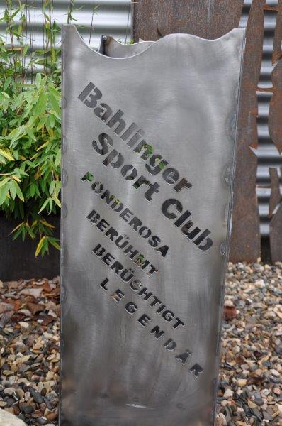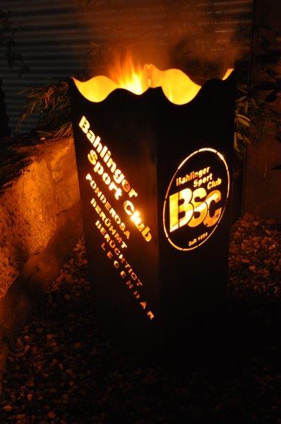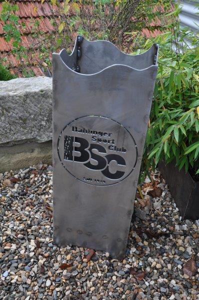 Der Feuerkorb ist aus 3 mm Stahl gefertigt. Das Vereinswappen und Schriftzug werden hochwertig gebrannt und per Hand zu einem Feuerkorb zusammen geschweißt.
